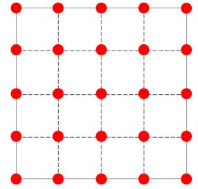 質(zhì)量采用 Sartorius BSA224S 分析天平測(cè)量,精度為0.1 mg。為了測(cè)量試片噴砂后的變形程度,將百分表( 成量川牌百分表, 量程 0~10 mm, 精度 0.01 mm) 垂直固定在已校準(zhǔn)的金屬平臺(tái)上。如圖 1 所示, 將一塊平板平分為 16 個(gè)方格, 噴砂后朝上放置在金屬平臺(tái)上, 測(cè)試 25 個(gè)節(jié)點(diǎn)的高度。