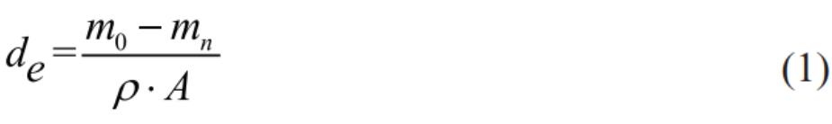 認(rèn)為試板的質(zhì)量減少是均勻減薄的結(jié)果。因此,引入基體當(dāng)量減厚參數(shù) (de), 其定義為基體質(zhì)量在規(guī)定面積內(nèi)減少的均勻厚度, 計(jì)算方法如公式(1) 所示: