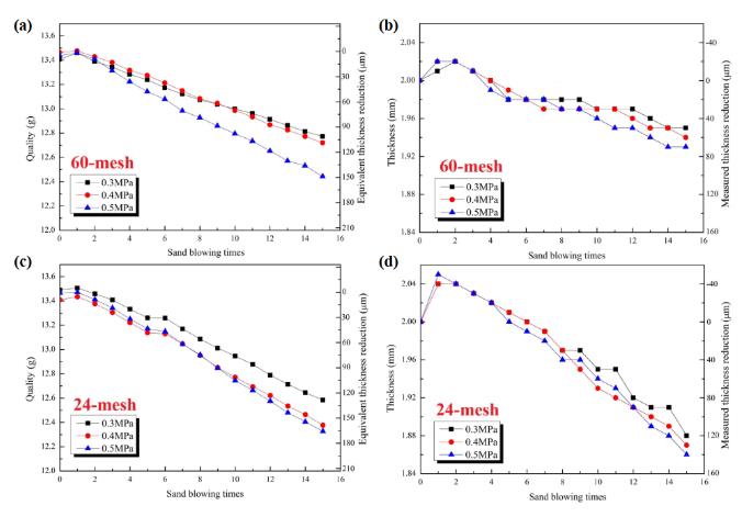 圖 5 鋁基材表面噴砂后質(zhì)量和厚度變化曲線:(a) 60 目, 質(zhì)量變化;(b) 60 目, 厚度變化;(c) 24 目, 質(zhì)量變化;(d) 24 目, 厚度變化