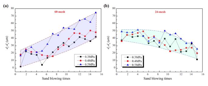 圖 6 鋁基材噴砂后當(dāng)量厚度與測(cè)量厚度的差值隨噴砂次數(shù)的變化:(a)60 目;(b)24 目