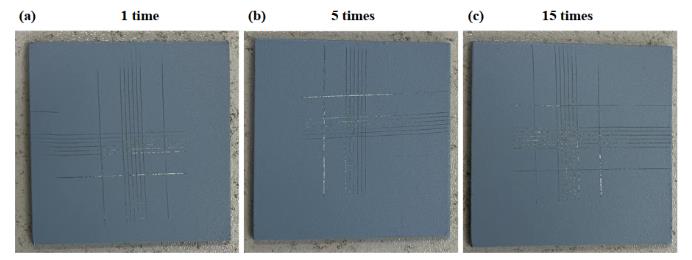 對(duì) 60 目砂 0.4 MPa 多次噴砂的鋁合金薄板表面涂覆約 0.05 mm 厚的丙烯酸聚氨酯有機(jī)涂層,干燥固化 1 天后, 采用劃格法測(cè)試其在鋁合金表面的附著力,結(jié)果如圖 8 所示。從圖中可以清晰地看出,噴砂 1 次、5 次和 15 次后,涂層在切割邊緣完全平滑 ,無(wú)一格脫落,即附著力達(dá)到 0 級(jí),主要是噴砂增大了表面粗糙度。因此,鋁合金薄壁件多次噴砂都能取得較好的附著力,能夠滿足應(yīng)用需求。